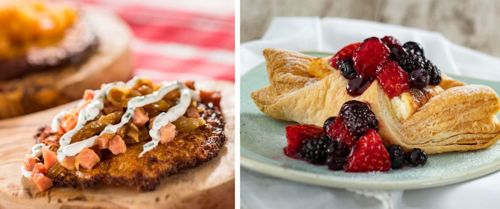 - Potato Pancake with Caramelized Ham, Onions, and Herb Sour Cream (gluten/wheat friendly).