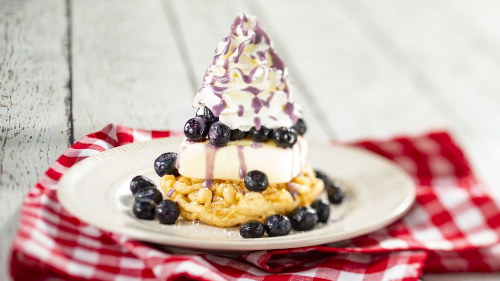 - Mini Funnel Cake topped with Lemon Cheesecake Ice Cream, Blueberries, and Powdered Sugar.