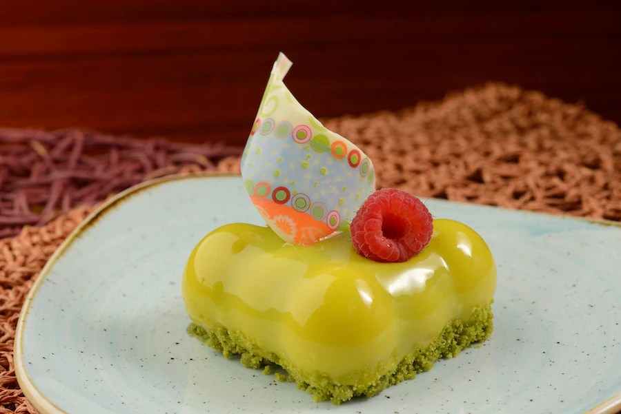 - Raspberry Fields: Pistachio financier, raspberry gelée, lemon curd, and a white chocolate glaçage (New)